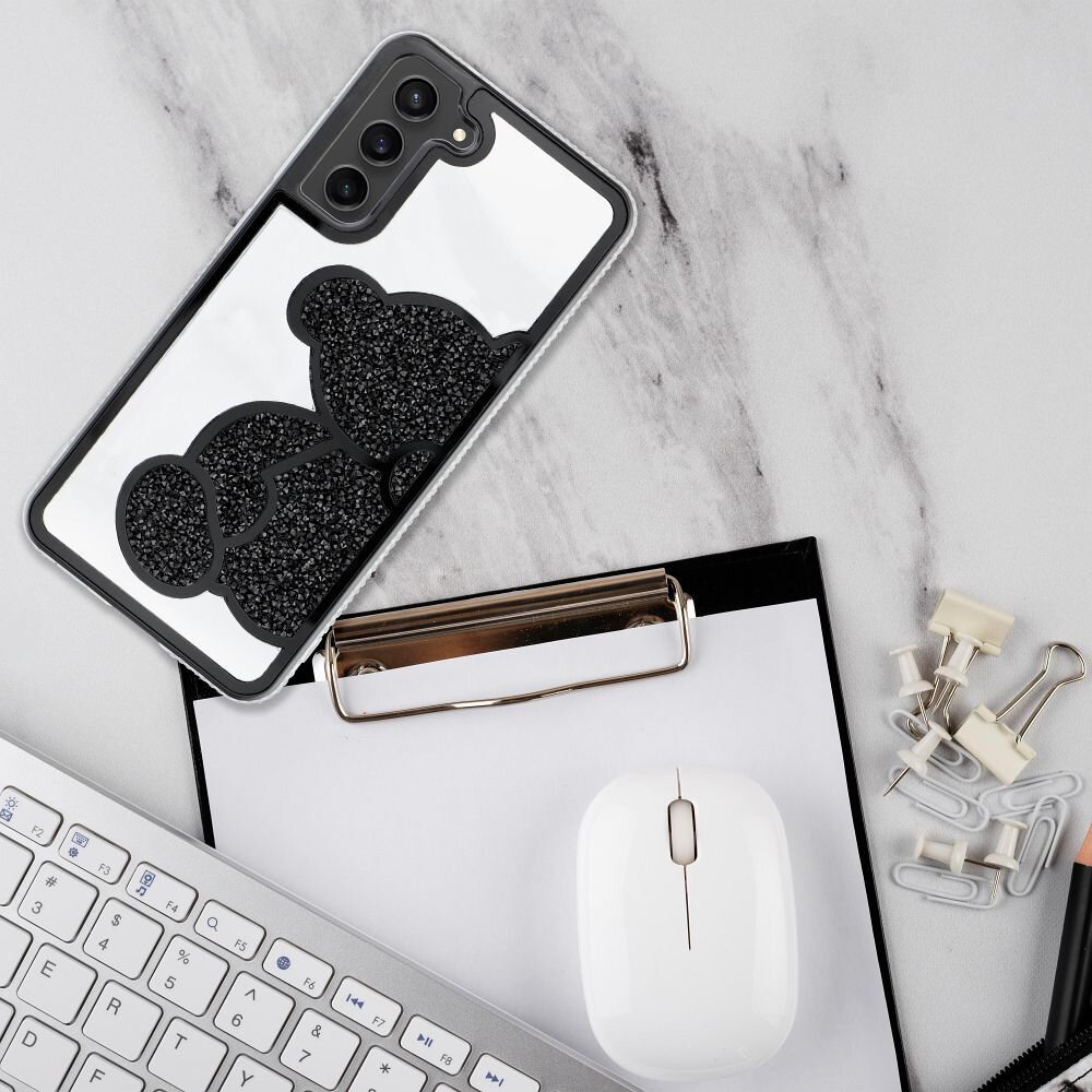 Teddy Bear to stylowy i funkcjonalny futerał, który wyróżnia się charakterystycznym, brokatowym wzorem pluszowego misia, podwyższonymi rantami oraz wykonaniem z tworzywa sztucznego.