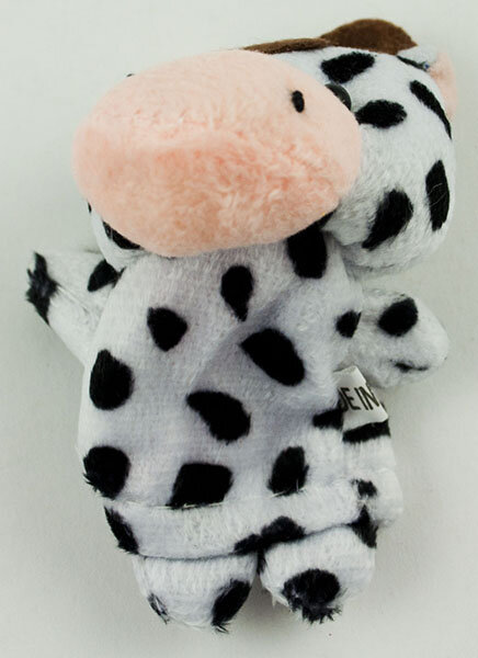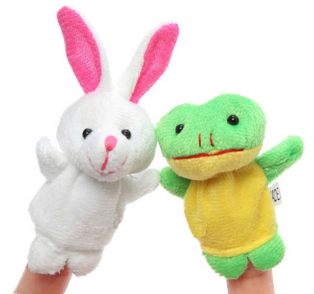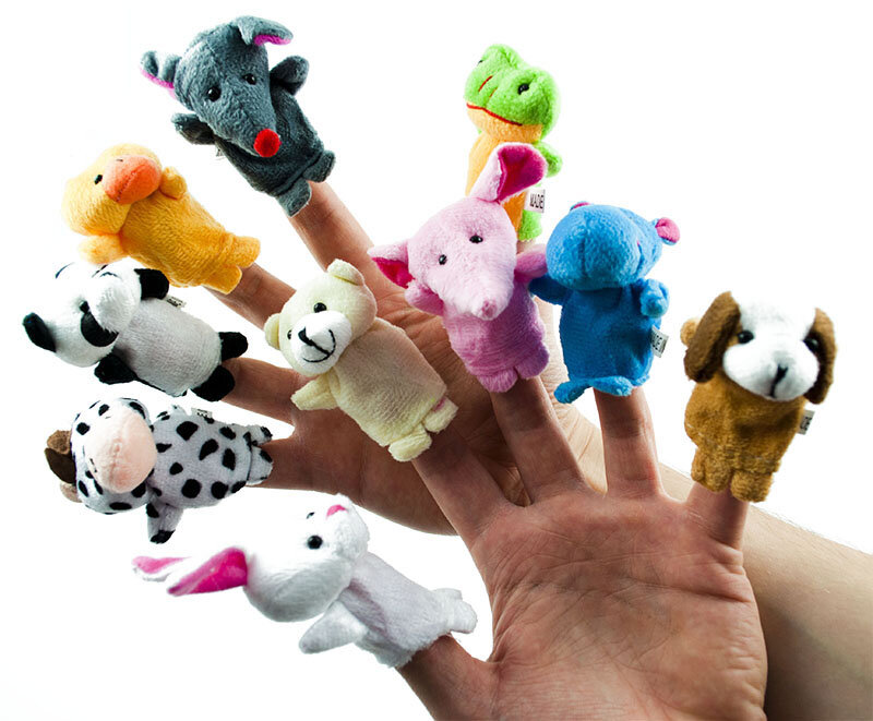 Komplet pluszowych, różnokolorowych pacynek na palce w kształcie zwierzątek: hipopotama, słonia, królika, kaczki, krowy, psa, pandy, niedźwiedzia, myszy i żaby. Komplet zawiera 10 pacynek. Wymiary: długość 6,5-7cm, szerokość 5,5-6cm.