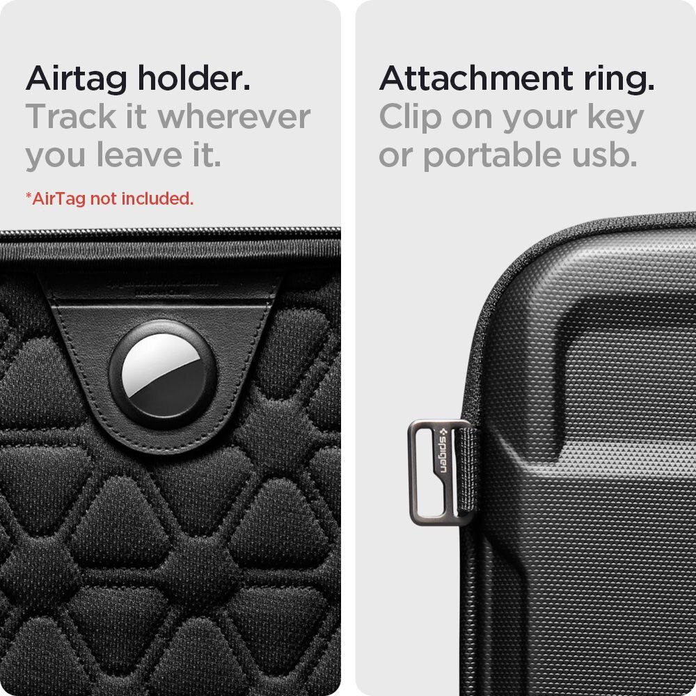 Case wyposażono w elastyczne pasy, które zabezpieczą laptopa nawet w trakcie korzystania, a dedykowany zatrzask na Apple Airtag pozwoli schować gadżet w bezpiecznym miejscu.